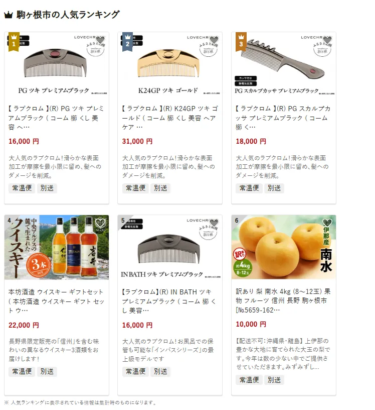 駒ヶ根市で人気の返礼品は、美容に嬉しいラグクロム製プレミアムコーム(ブラック)です。滑らかな仕上げで髪のダメージを抑えます。他には、地元ウイスキーのギフトセットや特産の南水梨も注目を集めています。寄付金は、子育てや教育環境の整備、また自然豊かな景観を守る環境保護に活用されています。