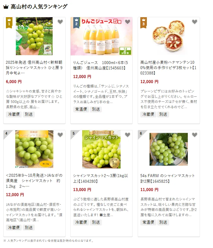 高山村で人気の返礼品は、新鮮朝採りシャインマスカット ひと房です。甘さと爽やかな酸味が絶妙で贈答用にも喜ばれます。他には、信州産りんごジュースや高山村産の小麦を使った手作りピザ3枚セットなども好評です。寄付金は、子どもの教育や地域医療の充実、また温泉郷や棚田を活かした観光資源の保全に活用されています。