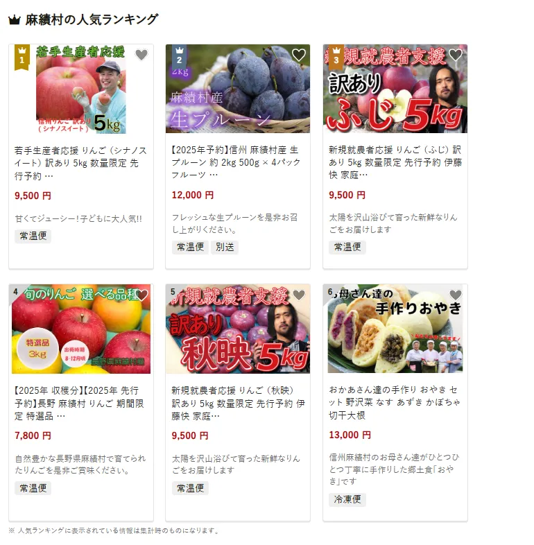 麻績村で人気の返礼品は、「若手生産者応援りんご(シナノスイート)訳あり5kg 」です。甘くてジューシーで子どもから大人まで人気のりんごをたっぷりお届け。他には「麻績村産 生プルーン」や「おかあさん達の手作りおやきセット」なども人気です。寄付金は、地域の教育環境整備や福祉向上に活用されています。