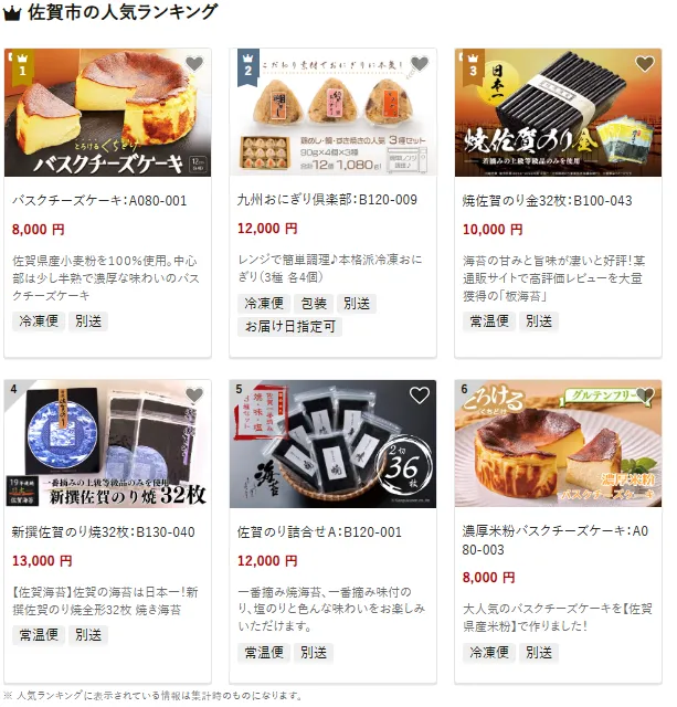 佐賀市で人気の返礼品は佐賀県産小麦粉100%使用の濃厚なバスクチーズケーキです。中心は少し半熟でとろける味わいが魅力です。他にもレンジで簡単調理できる本格派冷凍おにぎり3種セットや、甘みと旨味が評判の「焼佐賀のり金32枚」は、通販サイトでも高評価を多数獲得しています。