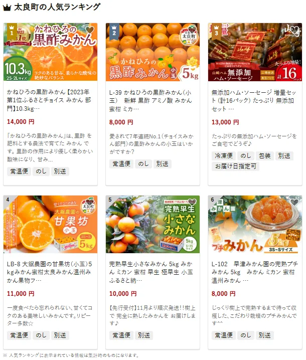 太良町で人気の返礼品は「かねひろの黒酢みかん」です。2023年のふるさとチョイスみかん部門で第1位に輝いたこのみかんは、黒酢とアミノ酸を含み、甘さと爽やかな酸味で絶品です。他にも10.3kgの大容量セットや、小玉のみかん5kgセットや、無添加のハム・ソーセージ増量セットもご家庭で楽しめる人気です。