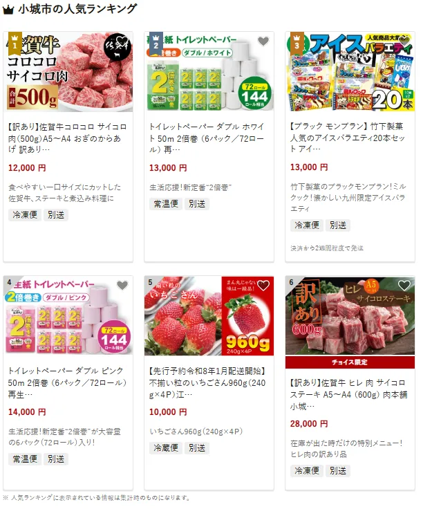 小城市で人気の返礼品はA5~A4ランクの佐賀牛を使った「訳ありサイコロステーキ」です。手軽に楽しめるひと口サイズで、ステーキや煮込み料理にぴったりです。他にも備蓄にも便利な2倍巻トイレットペーパーや、九州限定のアイス「ブラックモンブラン」が好評です。