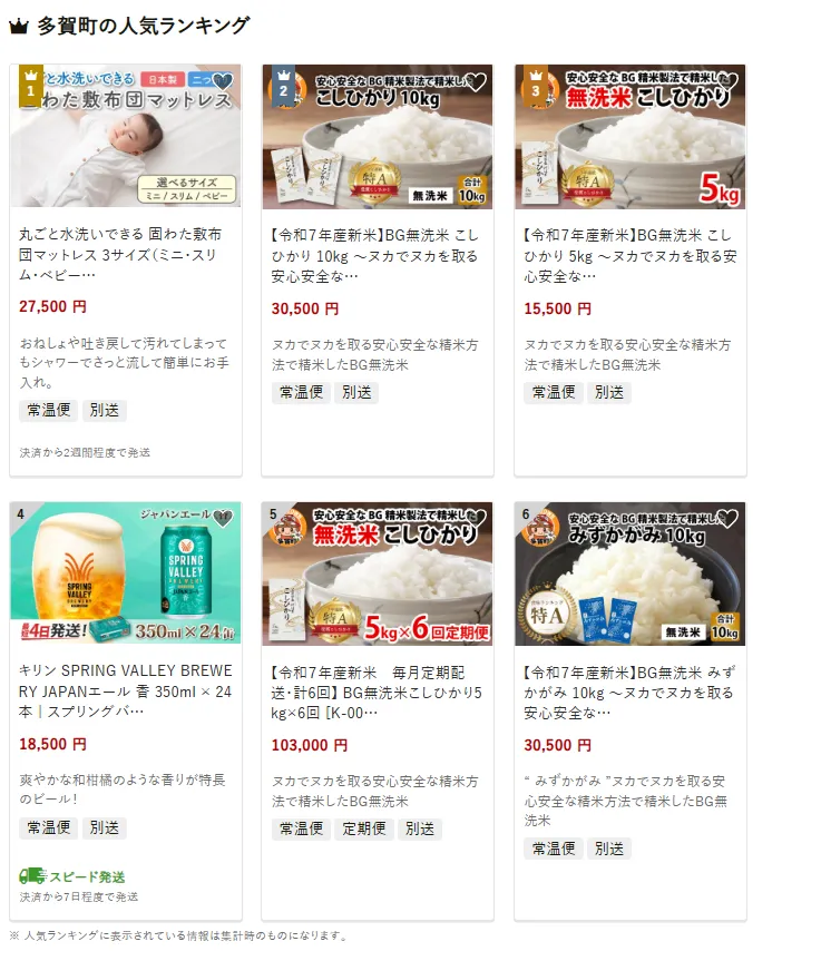 多賀町で人気の返礼品は、丸ごと水洗いできる固わた敷布団マットレス3サイズです。赤ちゃんから大人まで使いやすい仕様です。他には令和7年産新米BG無洗米こしひかり10kgセットやSPRING VALLEYエールビールなども揃います。寄付金は、保育や学校教育など子どもの成長支援、高齢者や障がい者の福祉、多賀大社を中心とした歴史文化の振興に活用されています。