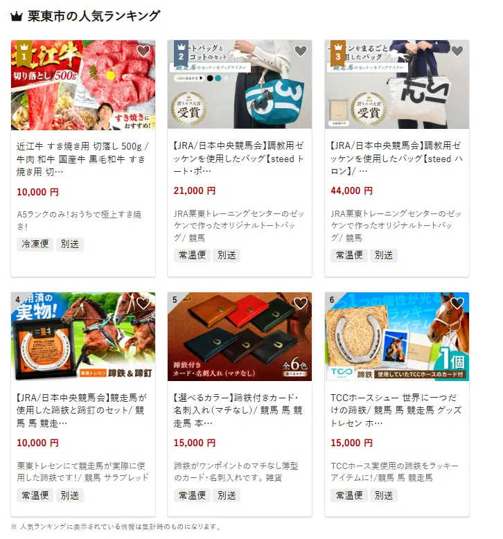 栗東市で人気の返礼品は、近江牛すき焼き用切り落とし500gです。柔らかく旨みの詰まった近江牛を堪能できます。他にはJRA調教用ゼッケンを使ったバッグや、踏鉄で作られたカードケースなど、競馬文化にちなんだ品も揃います。寄付金は、子ども・教育支援や高齢者福祉のほか、競馬場を活かした地域振興にも充てられています。