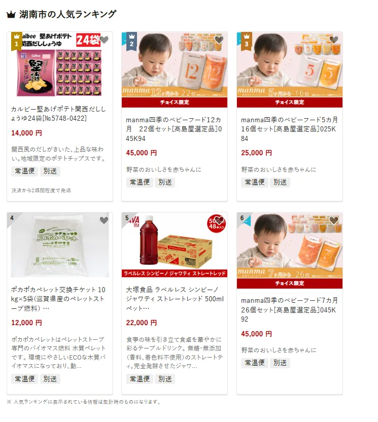 湖南市で人気の返礼品は、カルビー 堅あげポテト関西だししょうゆ24袋です。ご家庭のおやつや来客時にも喜ばれる人気商品です。他にはmanma四季のベビーフード12か月22個セットやポカポカペレット交換チケットなども選ばれています。寄付金は、学校整備や子育て支援などの教育、高齢者福祉や地域医療、そして地域資源を生かしたまちづくりに役立てられています。