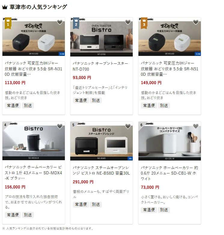 草津市で人気の返礼品は、パナソニック 可変圧力IHジャー炊飯器 おどり炊き5.5合 SR-N310ODです。ふっくら美味しいご飯を炊き上げます。他にはオーブントースター Bistro NT-D700、ホームベーカリーやスチームオーブンレンジなどの家電製品も揃います。寄付金は、子育て支援や学校教育、高齢者福祉や障がい者施策、さらに琵琶湖環境保全や都市整備に活用されています。