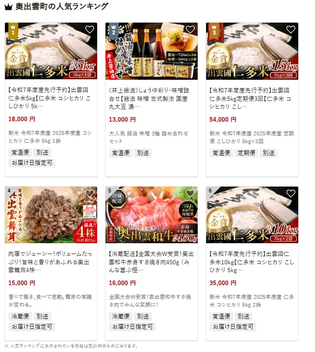 奥出雲町で人気の返礼品は、全国的にも評価の高いブランド米「出雲國仁多米」です。甘みと粘りが特長で、5kg単品や定期便3回セットで申し込めます。他にも老舗《井上醤油店》の「しょうゆ彩り・味噌詰合せ」は、丸大豆を使用した天然醸造のこだわり調味料セットです。料理好きや贈答用にも人気です。