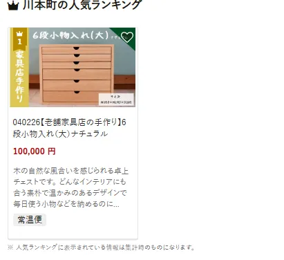 川本町の人気の返礼品は、老舗家具店が一つひとつ丁寧に仕上げた「6段小物入れ(大)ナチュラル」です。木の温もりを感じられるシンプルで実用的なデザインは、インテリアにもなじみやすく、収納力も抜群です。伝統技術と職人の手仕事が光る、長く使えるこだわりの逸品で、実用性と美しさを兼ね備えています。