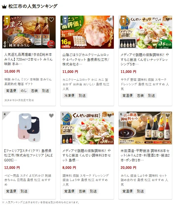 松江市で人気の返礼品は、伝統の李白酒造が手がける純米本みりん720ml×2本セットがです。他にもお弁当やおかずにぴったりで大好評の山陰の新鮮なカニを使ったカニクリームコロッケ4パックセットやメディアで話題のやすもと醤油の燻製ナッツドレッシング5本セットが人気の商品です。