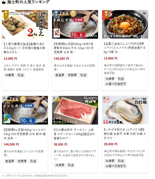 海士町で人気の返礼品は、日本海の離島で獲れた新鮮な「活さざえ」2kgセットです。壺焼きやお刺身、さざえご飯などに最適で、鮮度抜群の味わいが魅力です。また、定期便で届く「きぬむすめ」新米10kg×6ヵ月セットも好評で、毎月精米したてのお米が届く贅沢仕様です。他にも全国ご当地どんぶりTOP10に選ばれた「寒シマメ肝醤油漬け」も人気です。