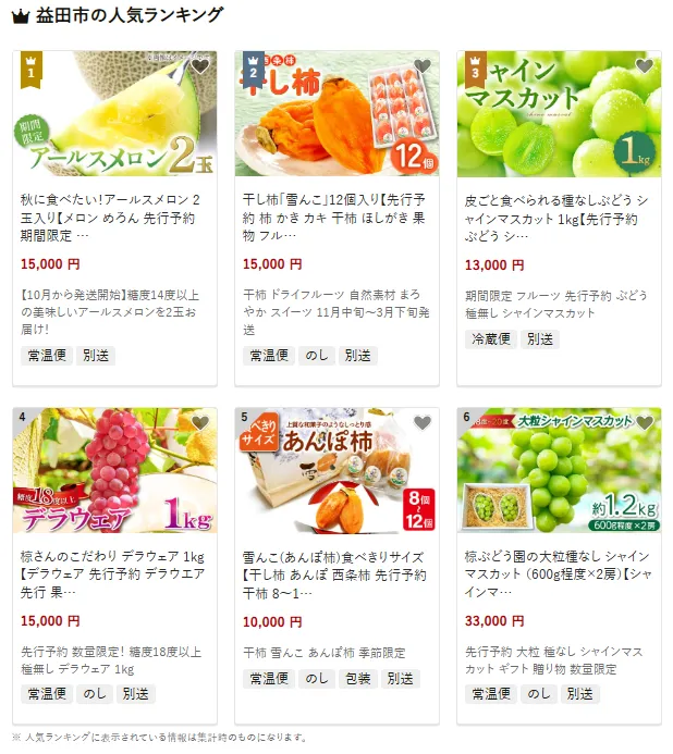 益田市の返礼品は糖度14度以上の青肉アールスメロン2玉入りが人気です。こちらは贅沢な甘さで季節限定の先行予約商品となっています。他にも、やさしい甘みが広がり和菓子感覚で味わえると話題の西条柿を使った干し柿「雪んこ」12個入りや、みずみずしさと食べやすさが魅力の皮ごと食べられる種なしシャインマスカット1kgが人気です。どれもギフトやご家庭用に喜ばれる逸品として人気を集めています。