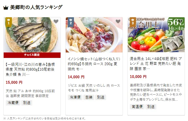 美郷町で人気の返礼品は、江の川の一級河川で育った鮮度抜群の天然鮎約800gです。季節限定で川魚好きにはたまりません。他にも冬と夏の猪肉を使った山椒つくね入りイノシシ鍋セットは、専用の飛魚だし付きで本格的な味わいを楽しめます。また、完熟たい肥を使用した発酵土で、健康な植物育成をサポートできる家庭菜園やガーデニングに最適な混合用土14L×4袋も人気です。