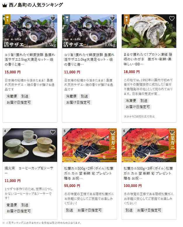 西ノ島町で人気の返礼品は、獲れたての新鮮な島獲れ活サザエセットです。2.5kgと1.0kgの大満足サイズがあり、壺焼きやさざえご飯、刺身など多彩に楽しめるのが魅力です。他にもプロトン凍結で鮮度を閉じ込めた隠岐の岩ガキも人気です。6〜7個入りで生食も可能で、BBQやカキ鍋に最適な逸品です。