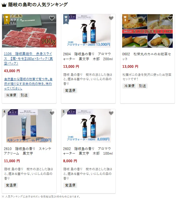 隠岐の島町で人気の返礼品は、島育ちのブランド和牛「隠岐黒磯牛」赤身スライスです。肩・モモ部位を真空パックで180g×5パックに小分けし、扱いやすく旨みもたっぷりです。他にも天然素材で癒される島ならではの逸品「隠岐島の香り アロマウォーター 黒文字」や獲れたての海の幸を手軽に楽しめる「松栄丸のカニのお総菜セット」が人気です。