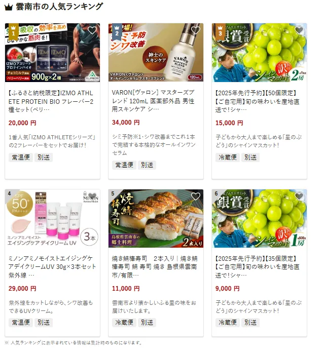 雲南市で人気の返礼品は、話題の「IZMOアスリートプロテインBIO」です。ベリーベリーとチョコミルクの2種セットで、健康や美容、トレーニングをサポートします。他にもシミ予防・シワ改善の医薬部外品オールインワンセラムでサントリー開発の「VARONマスターズブレンド」や、数量限定・先行予約の「シャインマスカット」2房セットなどが人気です。