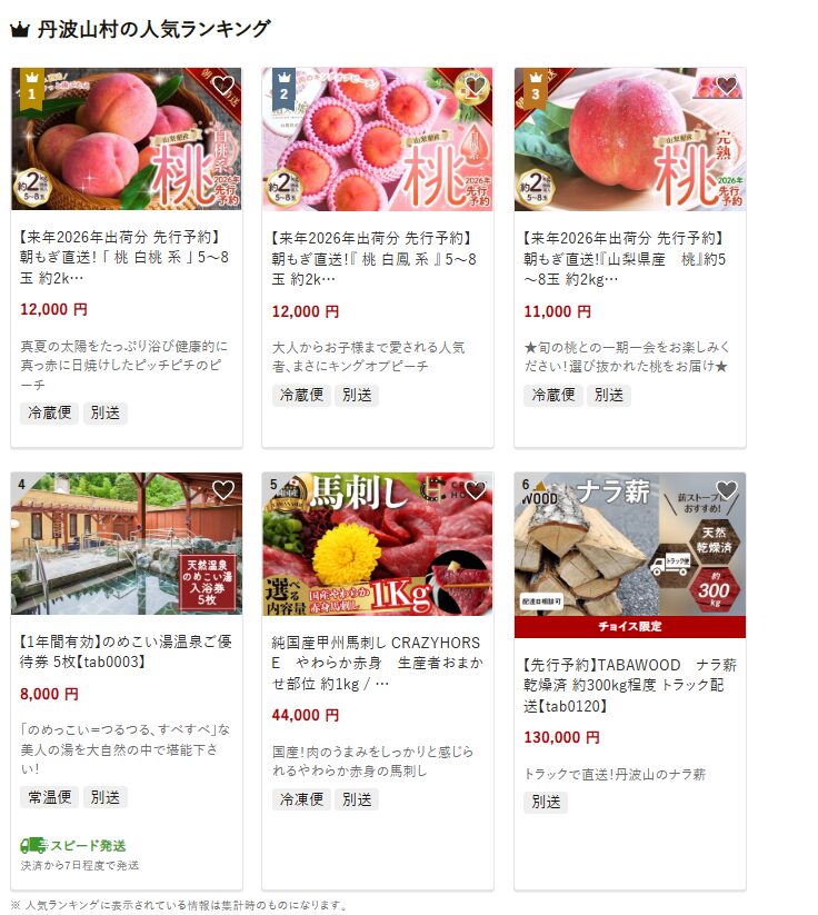 丹波山村で人気の返礼品は、「朝もぎ直送!桃 白桃系 約2kg」です。真っ赤に色づいた果実は、瑞々しい甘さが特徴です。他には、温泉優待券や馬刺し、ナラ薪なども注目。寄付金は、教育文化の推進や保健・医療・介護、観光や産業振興に活用され、自然と共生する村づくりを支えています。