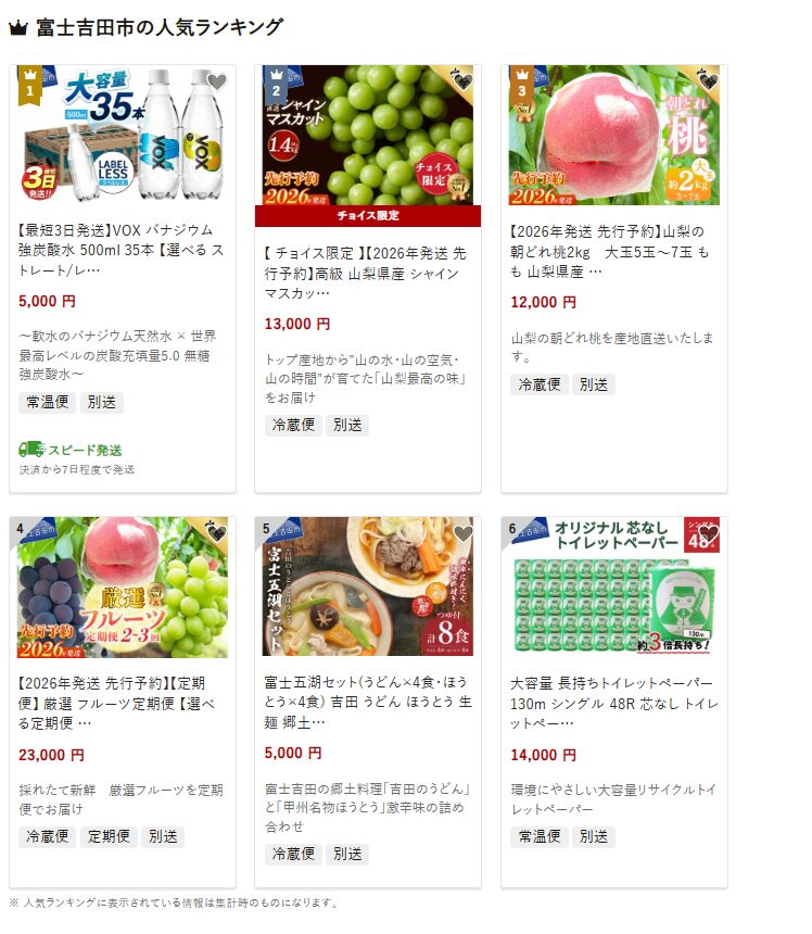 富士吉田市で人気の返礼品は、VOXバナジウム強炭酸水(500ml×35本)です。爽快な飲み口と大容量で人気。他には、山梨県産シャインマスカットや朝どり桃2kg、大容量トイレットペーパー48ロールなど、暮らしを支える品が並びます。寄付金は「健全な地域経営の推進事業」や「教育支援事業」に活用されています。