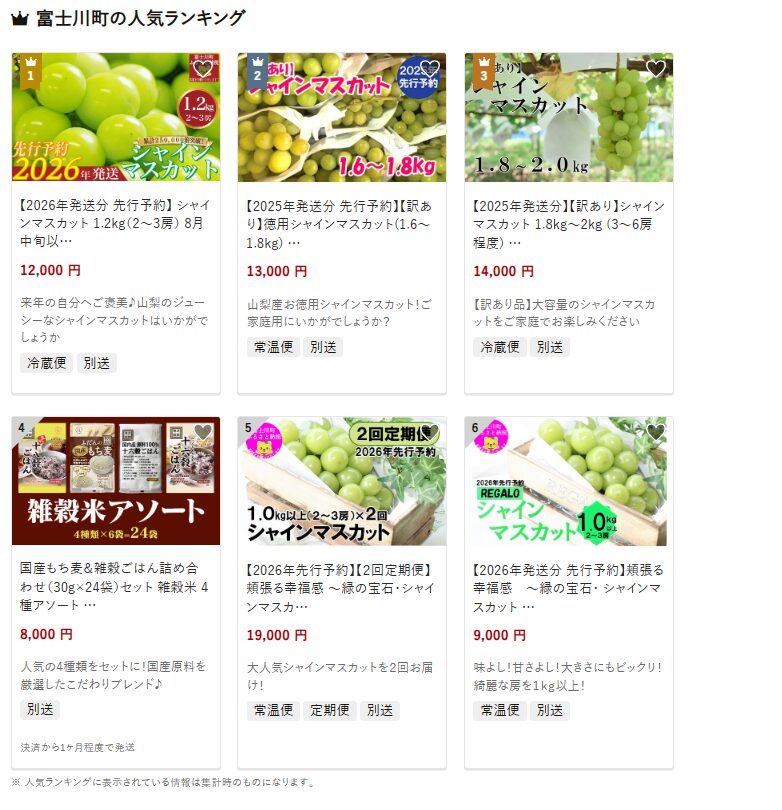 富士川町で人気の返礼品は、先行予約のシャインマスカット(1.2kg 2~3房)です。瑞々しい果実が家庭用にも贈答用にも喜ばれています。他には、雑穀米アソートセットや、定期便で届くシャインマスカット2回分なども人気。寄付金は「豊かな人材と文化を育むまちづくり」や「健やかで笑顔あふれるまちづくり」に活用されています。