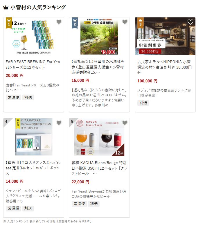小菅村で人気の返礼品は、クラフトビール「FAR YEAST BREWING Far Yeastシリーズ缶12本セット」です。華やかな香りとキレのある味わいが特徴で、飲み比べセットはギフトにも喜ばれます。他には登山道整備支援金や古民家ホテル宿泊券など、自然や文化を楽しめる返礼品も豊富です。寄付金は「森と水の保全」や「子どもたちの育成支援」に活用され、源流の村ならではの豊かな自然と未来を守っています。