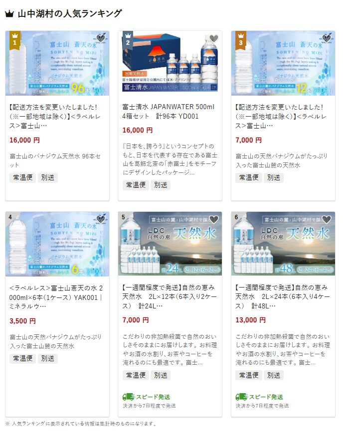 山中湖村で人気の返礼品は、富士山のバナジウム天然水96本セットです。バナジウムを豊富に含む「富士山の水」は清涼感あふれる味わいで、日常の飲用や料理にも最適です。他には大容量ペットボトルの定期便や富士山ブランドのミネラルウォーターが揃っています。寄付金は「自然環境の保全」や「地域活性化」に活用され、富士山と湖の恵みを守りつつ、観光地としての魅力向上に繋がっています。
