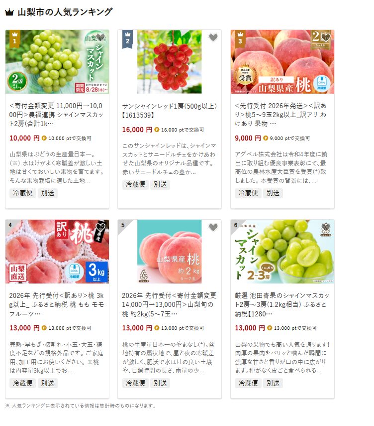 笛吹市で人気の返礼品は、「先行予約!大玉桃 4~6玉 約2kg」です。糖度保証付きで甘みたっぷりの桃は全国でも高い評価を得ています。他には、シャインマスカットや食べ比べセットも人気。寄付金は、「日本一の桃源郷」を守るための自然景観保全や子育て支援、教育充実に活用されています。