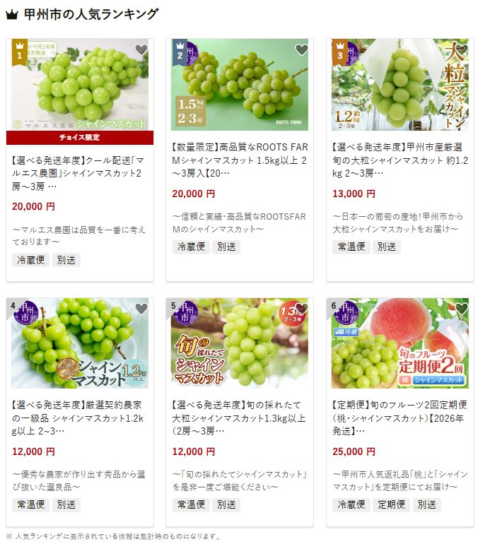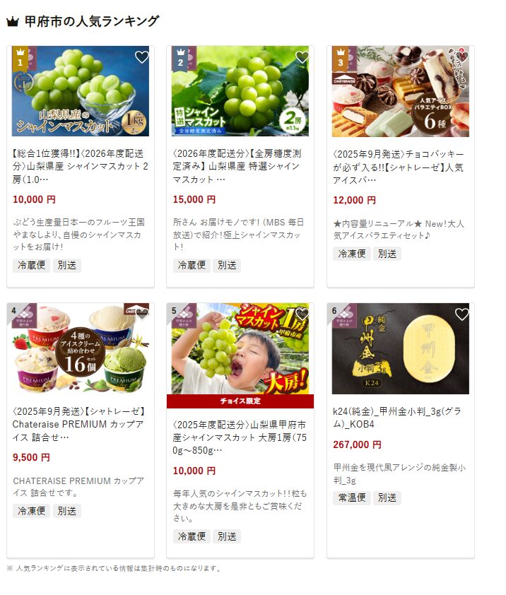甲府市で人気の返礼品は、山梨県産シャインマスカット2房です。ぷりっと弾ける果肉と爽やかな甘みが特徴で、約1kg~2房のセットは食卓を華やかに彩ります。他にはシャトレーゼのアイスバーや甲州金小判など、個性豊かな品も注目を集めています。寄付金は「甲府市総合計画に基づく施策推進」や「子どもの教育・文化・スポーツ振興」に活用され、地域の未来づくりに役立てられています。