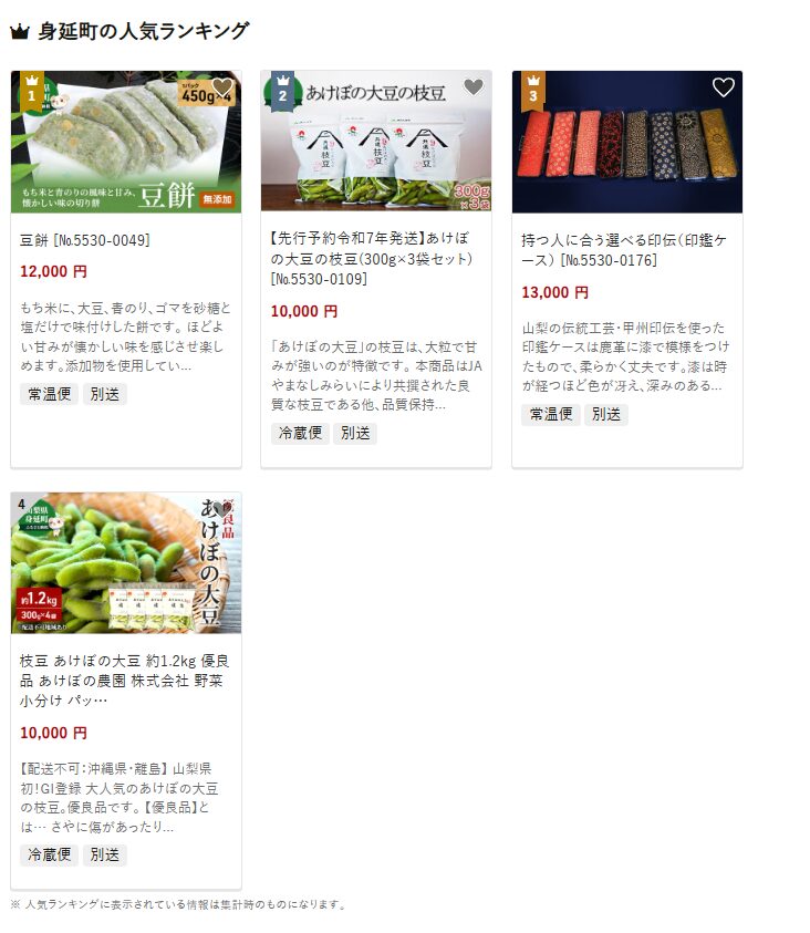 身延町で人気の返礼品は、豆餅です。甘味が懐かしい味わいを感じさせる、地元ならではの素朴な味わいが楽しめます。他には伝統工芸の印伝製品など、地域文化に触れられる品も魅力です。寄付金は「本栖湖の水産資源の復活」や「子どもの発想を活かしたまちづくり」に活用され、未来を担う人材育成や地域文化の継承に繋げています。