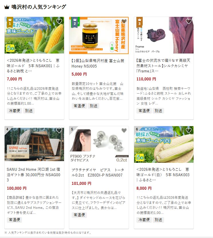 鳴沢村で人気の返礼品は、朝採れとうもろこし「恵味ゴールド」5本セットです。甘みが強く、子どもから大人まで楽しめる人気品。他には、富士山麓産のハチミツや、シルクカシミヤストール、河口湖近くで宿泊できる体験ギフト券も選ばれています。寄付金は「教育文化の推進」や「産業・観光の振興」に活用されています。