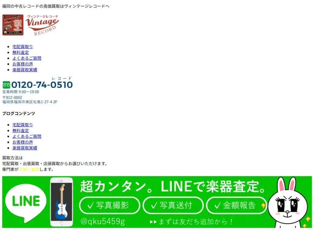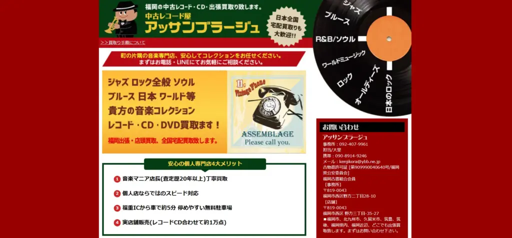 | 買取品目 | レコード全般、レコードプレーヤー、針(カートリッジ)、フォノイコライザー、アンプ、スピーカーなどの周辺機器 |