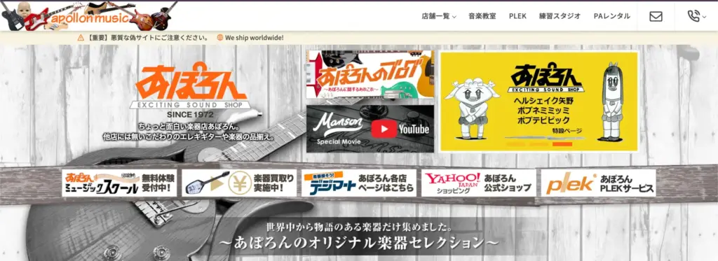 買取品目ギター、ベース、弦楽器、管楽器、鍵盤楽器、ドラム、音楽機材、パーカッション、DJ機材、音響機材、レコーディング機材・PA・DAWなど