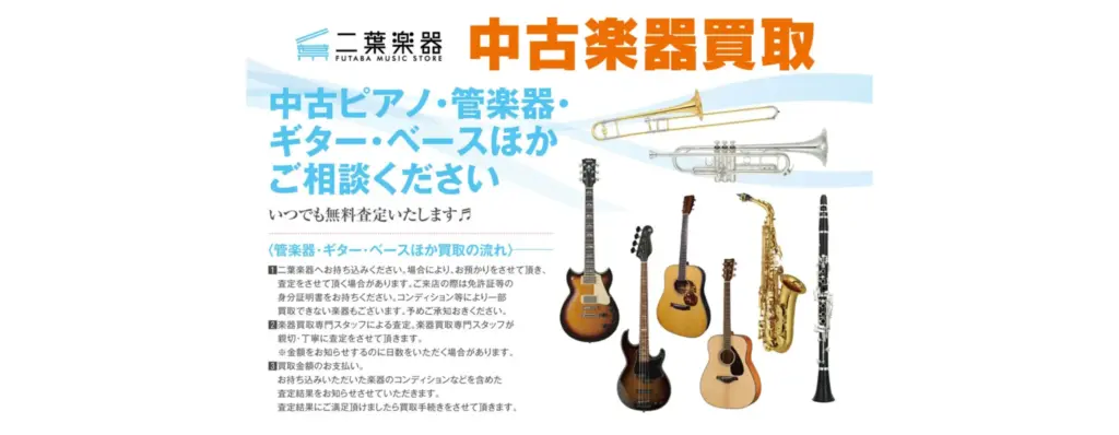 自分の楽器がいくらで買い取ってもらえるか気になる人は一度無料出張査定に申し込んでみてくださいね!