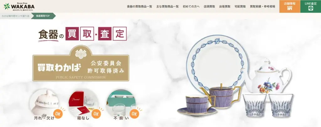 | 買取品目 | アウガルテン、アラビア、イッタラ、ウェッジウッド、エインズレイ、エルメス、大倉陶園、クリストフル、KPMベルリン、セーブル、ティファニー、ナルミ、ノリタケ、バカラ、ファイヤーキング、フッチェンロイター、ヘレンド、マイセン、ミントン、リーデル、リチャードジノリ、リモージュ、リヤドロ、ロイヤルアルバート、ロイヤルコペンハーゲン、ロイヤルドルトン、ローゼンタール、ロールストランドなど |