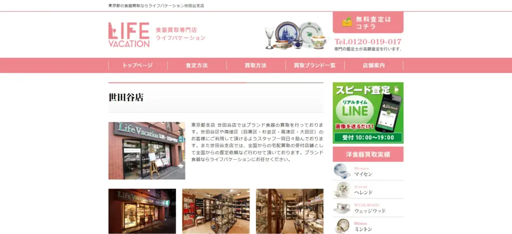 | 買取品目 | アウガルテン、アラビア、イッタラ、ウェッジウッド、エインズレイ、エルメス、大倉陶園、クリストフル、KPMベルリン、セーブル、ティファニー、ナルミ、ノリタケ、バカラ、ファイヤーキング、フッチェンロイター、ヘレンド、マイセン、ミントン、リーデル、リチャードジノリ、リモージュ、リヤドロ、ロイヤルアルバート、ロイヤルコペンハーゲン、ロイヤルドルトン、ローゼンタール、ロールストランドなど |