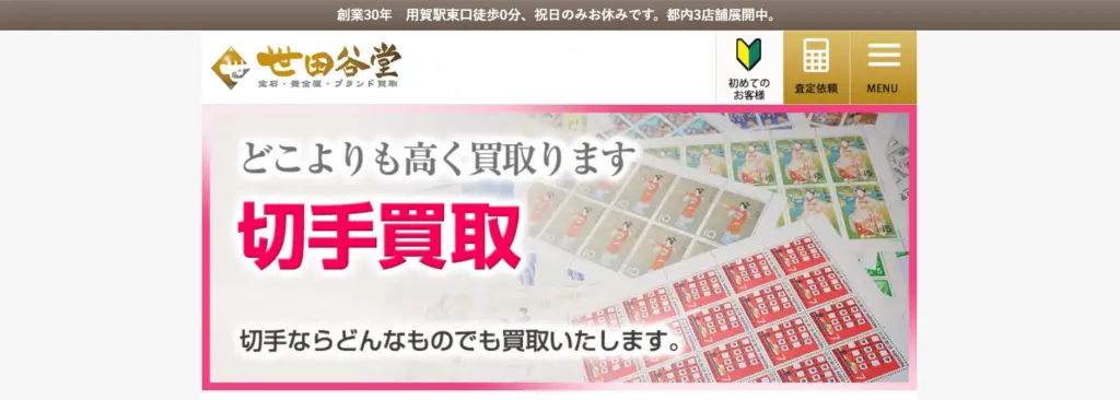 | 買取品目 | 日本切手、中国切手、琉球切手、特殊切手、記念切手、年賀切手、普通切手、旅行券、その他金券 |